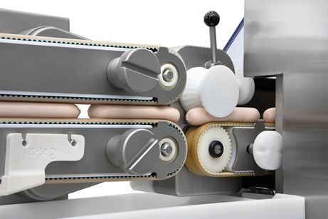 Функция навешивания в производстве сосисок на новом уровне открывает возможности дальнейшего потенциала для инновационных решений и высокоэффективных процессов. Разработка нового крюка предоставляет возможность навешивать снеки очень близко друг к другу (калибр 8 и калибр 10). Благодаря этому загрузка коптильной камеры значительно увеличивается, что приводит к снижению затрат.