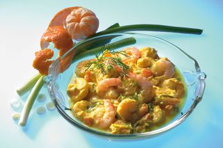 Салат с креветками, салат с сельдью, морепродукты и др.
